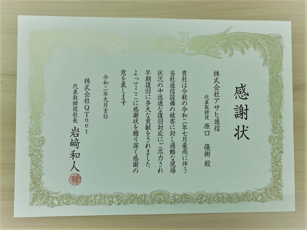 令和2年7月、熊本県人吉市の豪雨に伴う災害復旧作業で株式会社QTNet様より感謝状を頂きました。ありがとうございます。